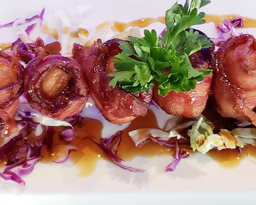 6 bacon wrapped scallops, baked and drenched with teriyaki sauce
