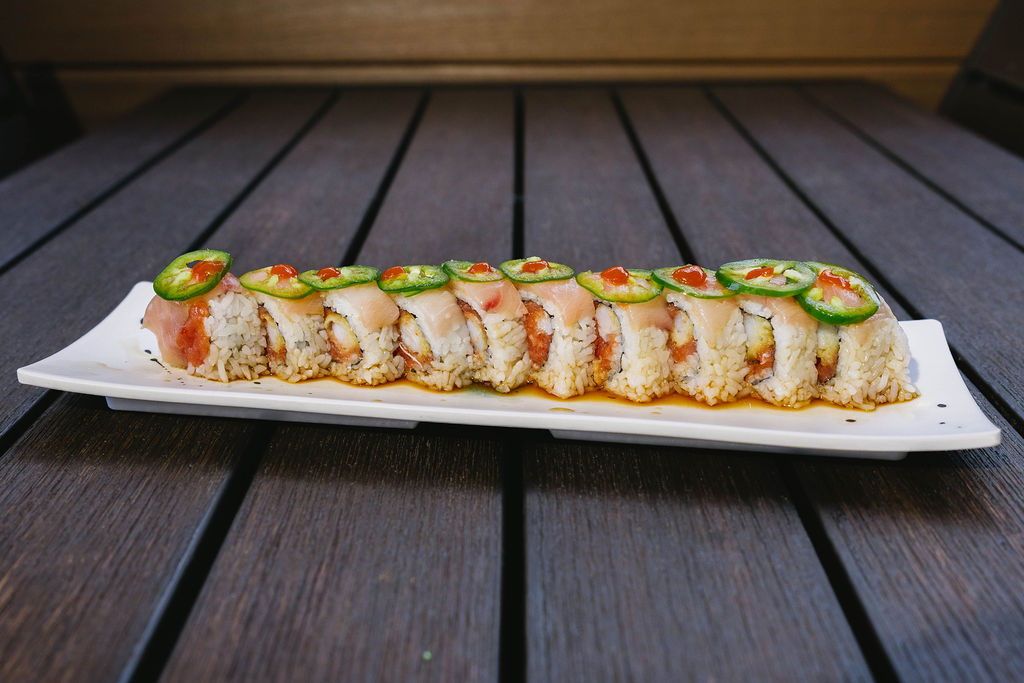 Outside: fresh yellow tail, jalapenos, drizzled with ponzu sauce and a dab of sriracha