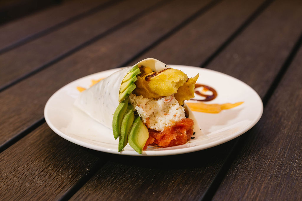 Shrimp tempura, spicy tuna, crab meat, avocado, with spicy sauce and sweet sauce topped with tobico, wrapped in soy paper.