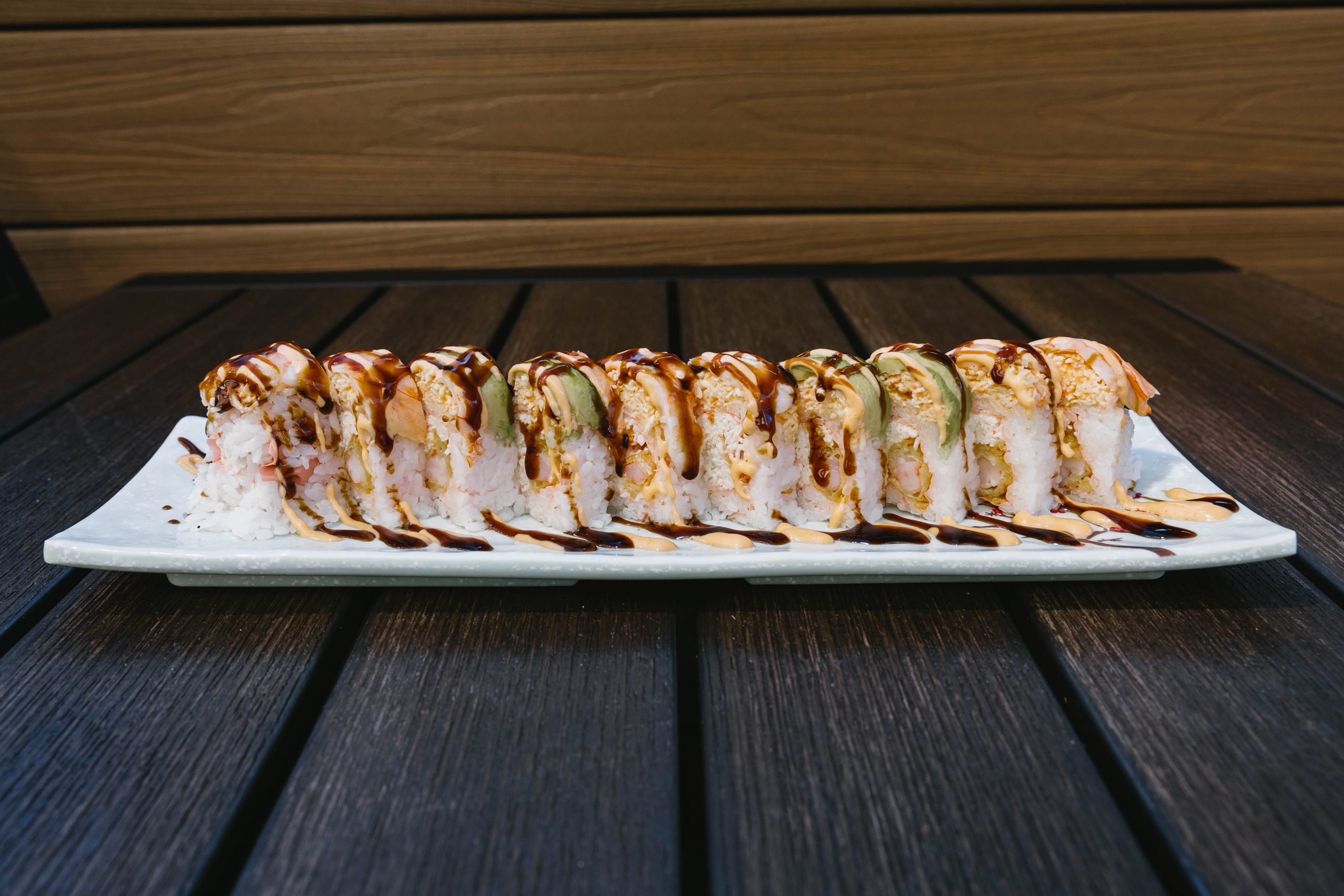 Outside: spicy crab, avocado, drizzled with spicy mayo and sweet sauce all wrapped in a pink soy paper!