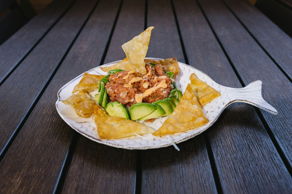 Mixture of tuna, cilantro, macadamia nuts, ginger, avocado and white onion,
